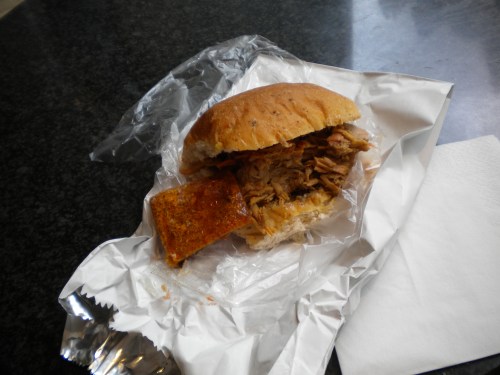 The Sandwich: A base layer of haggis spread on a brown roll, piled up with the pork from the window, and then topped with a spicy chili sauce. And notice, the salty, crispy cracklin’ (pork skin) that they threw in as a bonus