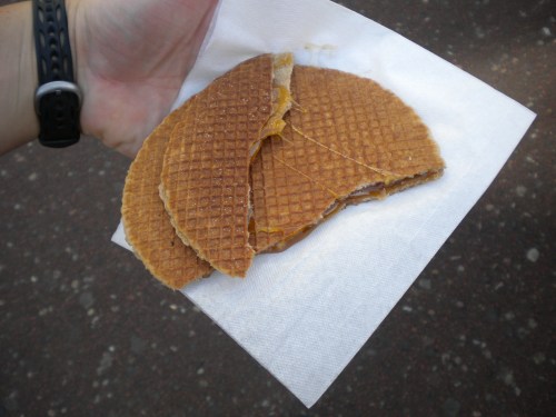 A Stroopwafel (sp?): 2 pisselle-like, thin waffles with a layer of sweet caramel in the center