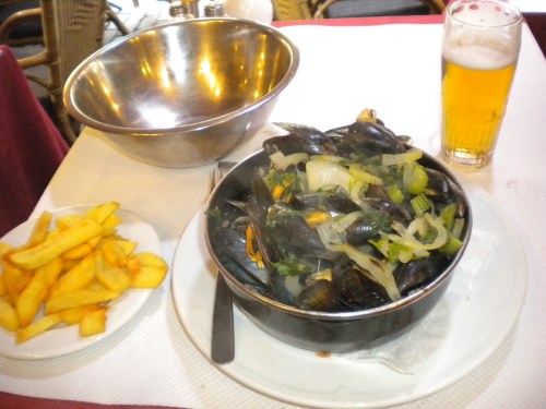 Brussels in Mussels? Apparently it is the national dish — in this case cooked in white wine and served in a steaming in a cauldron