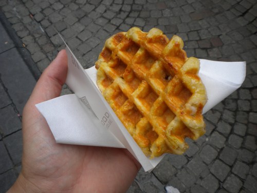 The guys from “Taste of Belgium” in the North Market in Columbus weren’t kidding: this really is how they serve waffles in Belgium. Instead of the light an airy concoctions dusted with powedered sugar we think of, they are much smaller, denser, gooey, and with the sugar in the dough already caramelized to an almost-crunchy exterior