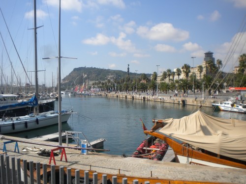 La Barceloneta Harbor in the foreground, with the statue of Christopher Columbus atop a column (which marks one end of La Rambla) in the mid-ground, and the Olympic Mountain in the background (site of the 1992 Winter Games)