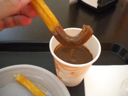 Churros con Chocolate – a favorite late-night snack for folks in Madrid. Basically, it is a chunk of fried dough that is dipped in a syrupy hot chocolate