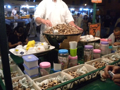 The highlight of any culinarian’s tour of Marrakesh is easily the night market at Djeema el Fna, the main square — where at dusk each night, dozens of food vendors open up shop and provide a variety of dishes and delights for those adventurous eaters out there.  Between the pushy touts, the constant smoke, the glare of the lights, and the smells of everything you can imagine being cooked, this nightly scene takes on a magical aire that I’ve never seen reproduced elsewhere.