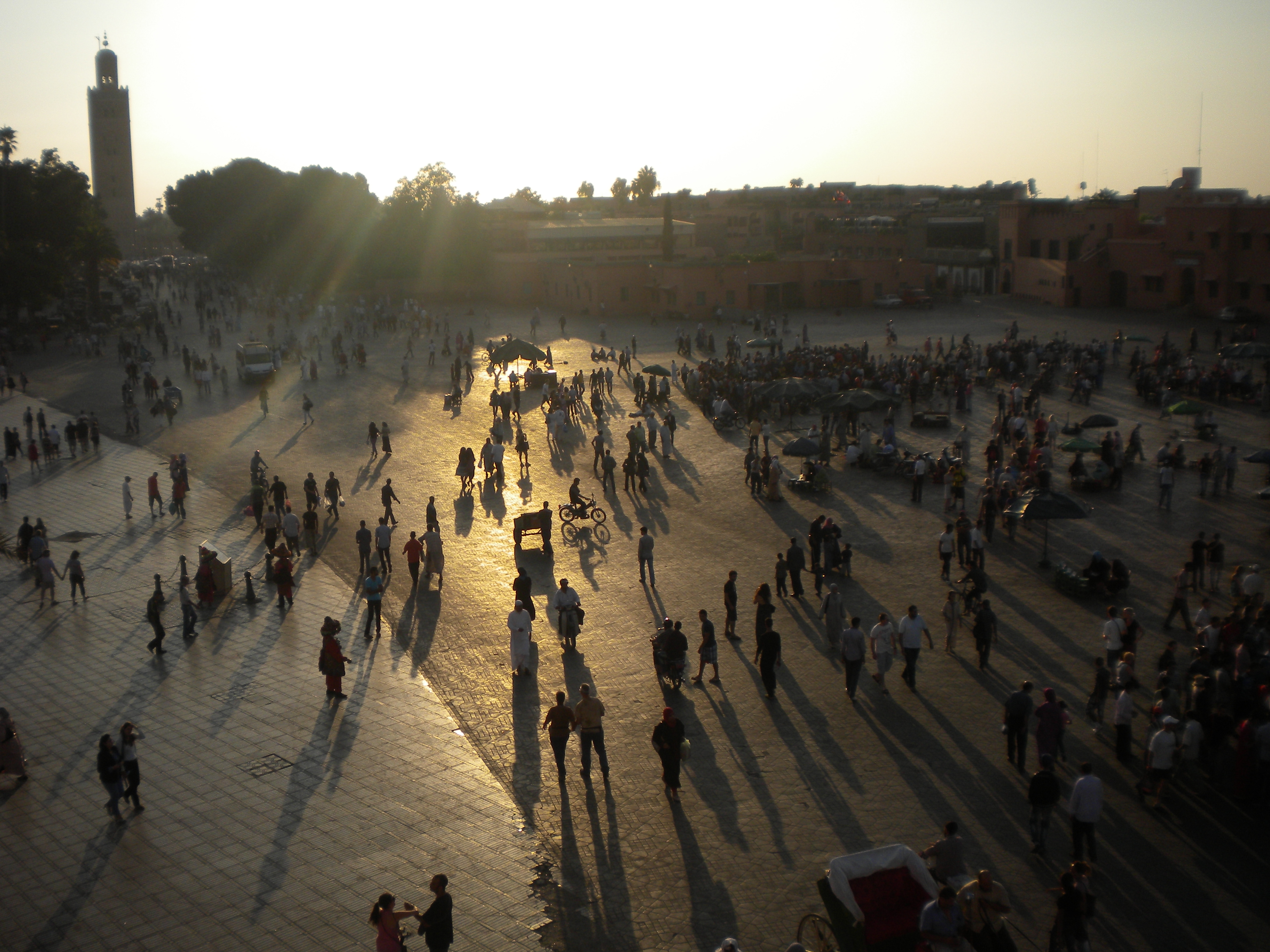 The sun casting shadows over the Djeema el Fna square, with the ever-present Koutoubia Mosque visible to the left