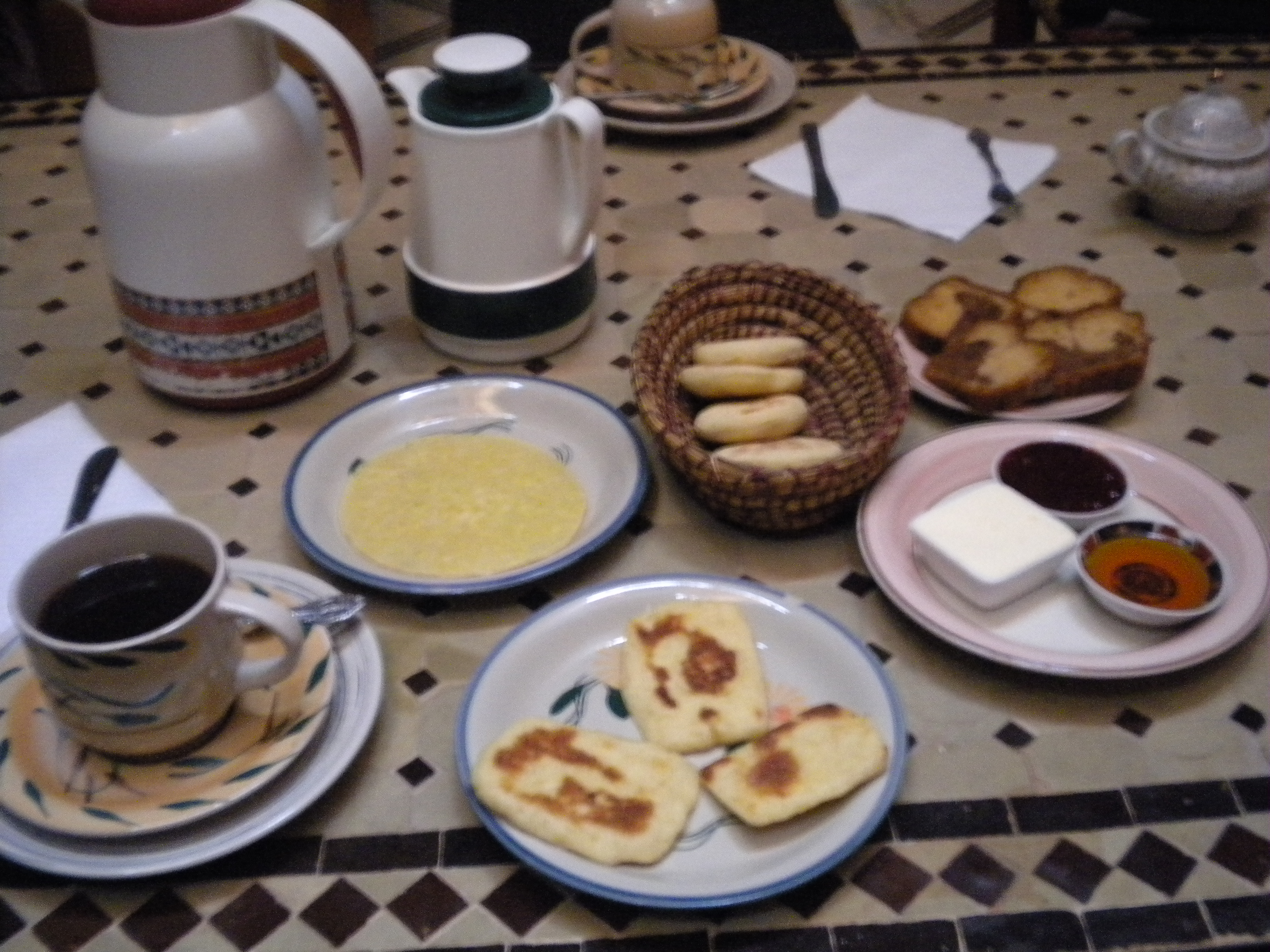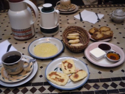 A typical breakfast, heavy in bread and carbs, served with honey, jam, and butter