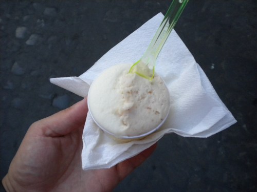 A scoop of Mandarin Orange and scoop of Pear Gelato