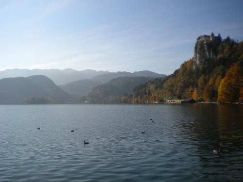 And of course, as soon as I finished the 2+ hour hike around the lake, the clouds decided to open up and deilver a beautiful sky. Seen here is the Bled Castle on the cliff to the right with the barely discerable Church of the Assumption in the shadows of the mountains to the left