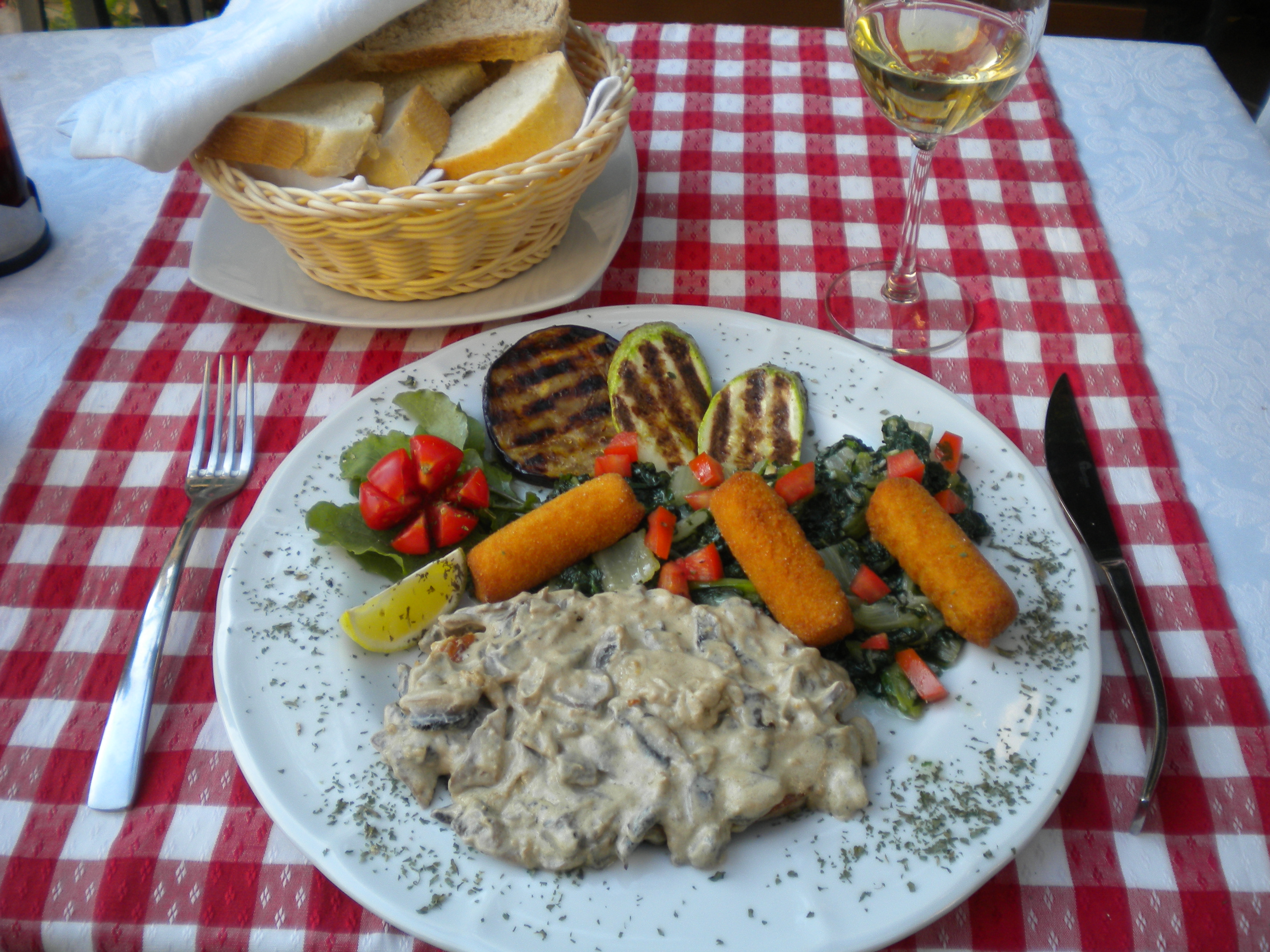 Chicken in a Mushroom Sauce with Grilled Veggies, Spinach, and Croquettes