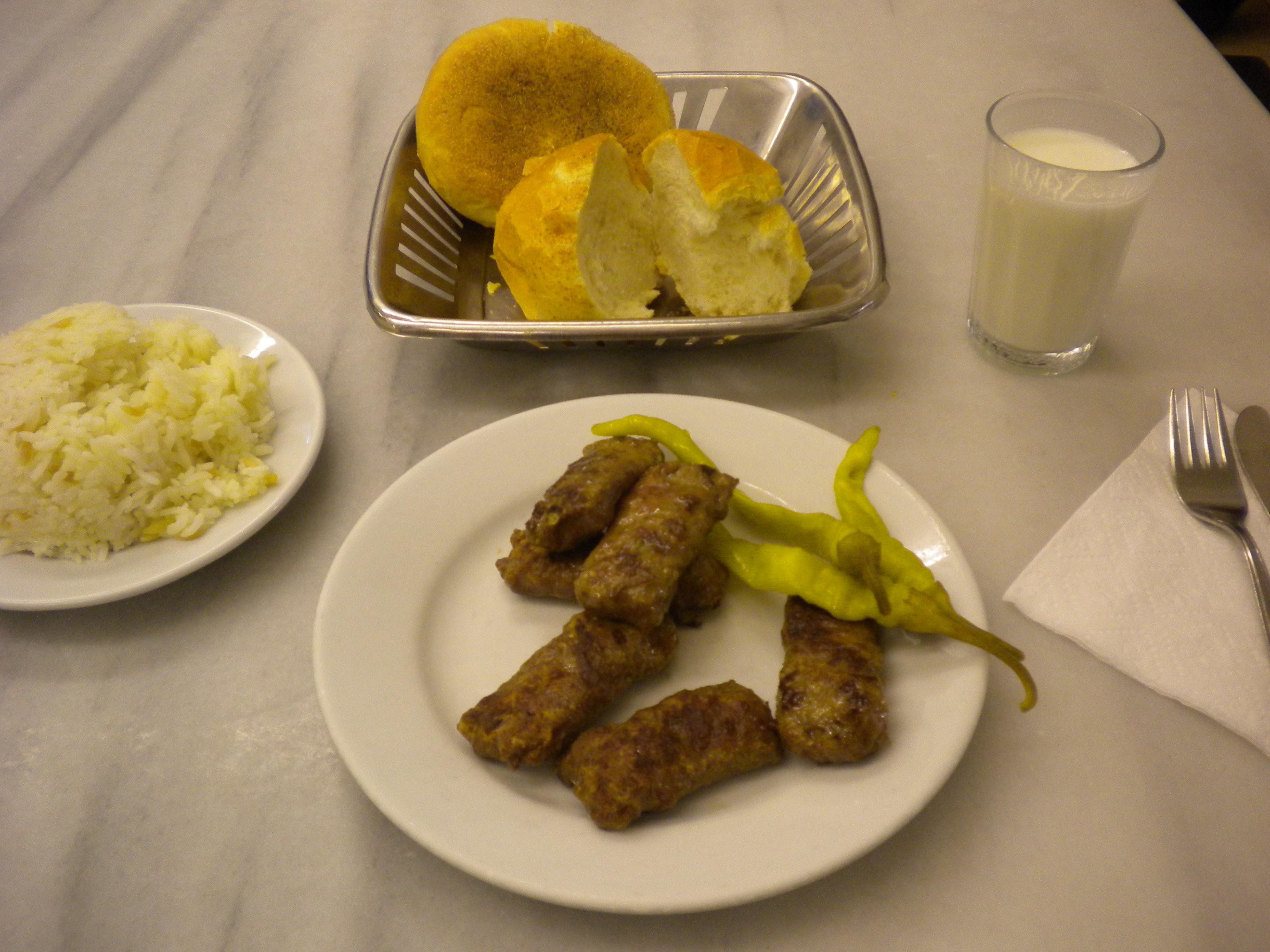 And lastly, the kofte kebab. In this iteration, small finger-like meatballs (not unlike the Chevapi I found a little further west) are grilled and served alongside pickled peppers and the usual pide bread