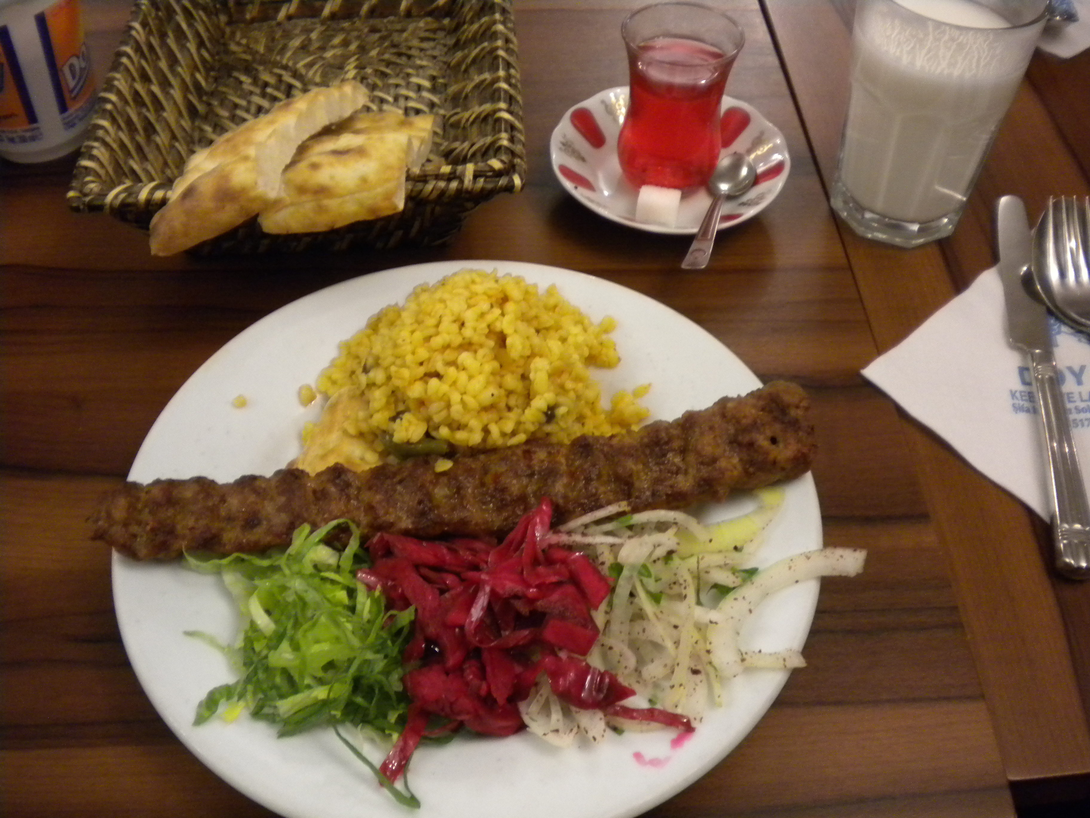 Another variety of kebab is grilled on a skewer and served with the accompaniments on the side. Seen here is the Adana Kebab (where the meat is mixed with mildly spicy peppers). Another variation that looks almost identical is the “Urfa Kebab,” with is slightly thicker and without the spice
