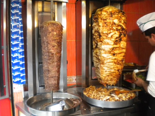 The ever-present cones of meat represent the backbone to the most common form of Kebab: The Doner Kebab (or Gyro). After piling up layer upon layer of either beef, chicken, or lamb onto a skewer, it is then allowed to slowly cook away on a vertical spit. Most kebab joints like this don’t even need signs, as the aroma wafting out into the street is all the advertising that is required
