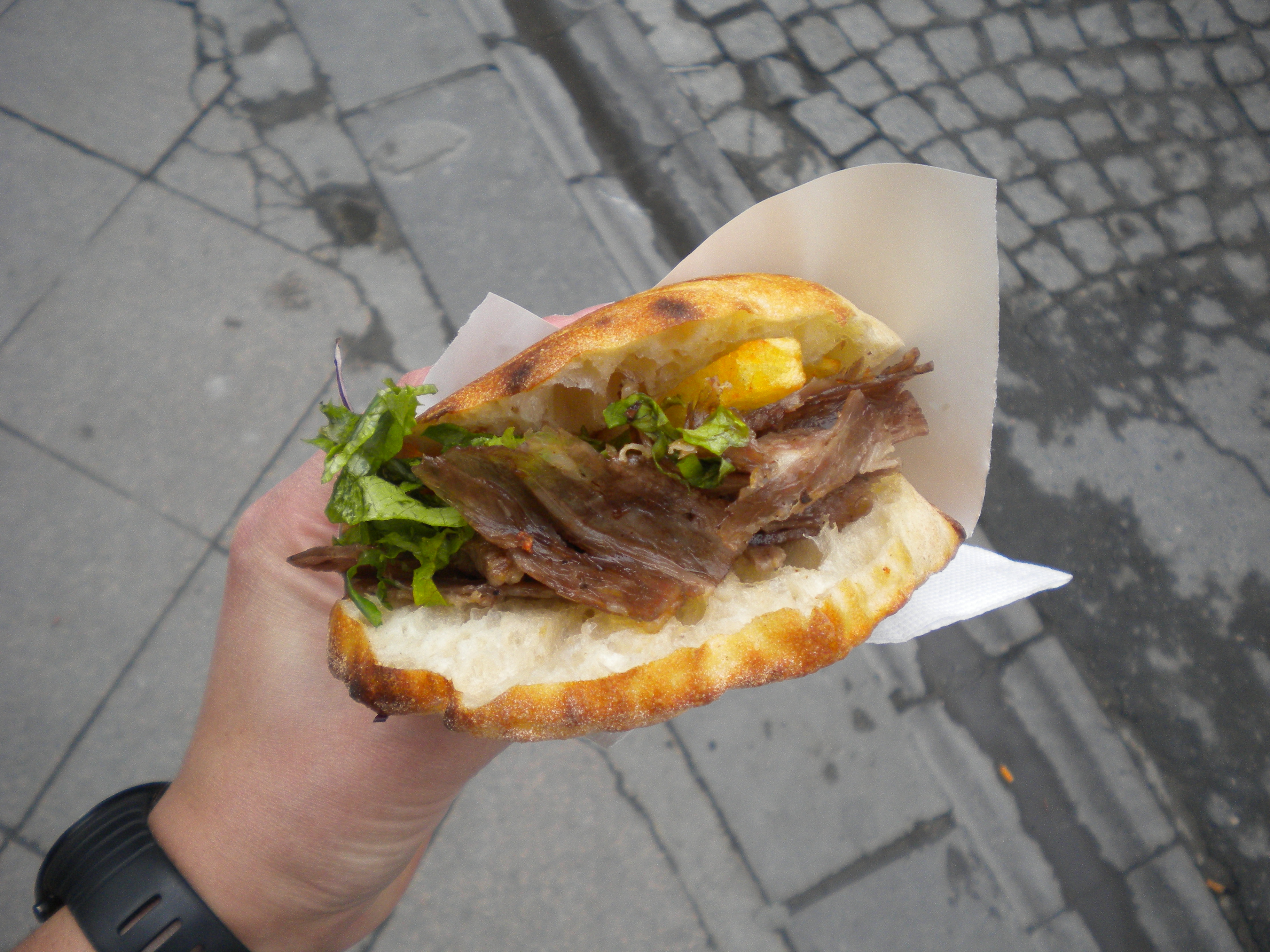 Seen here is a Doner Kebab made with Lamb meat stuffed into a Pide (or pita) bread alongside lettuce, onion, tomato, and even a few French Fries