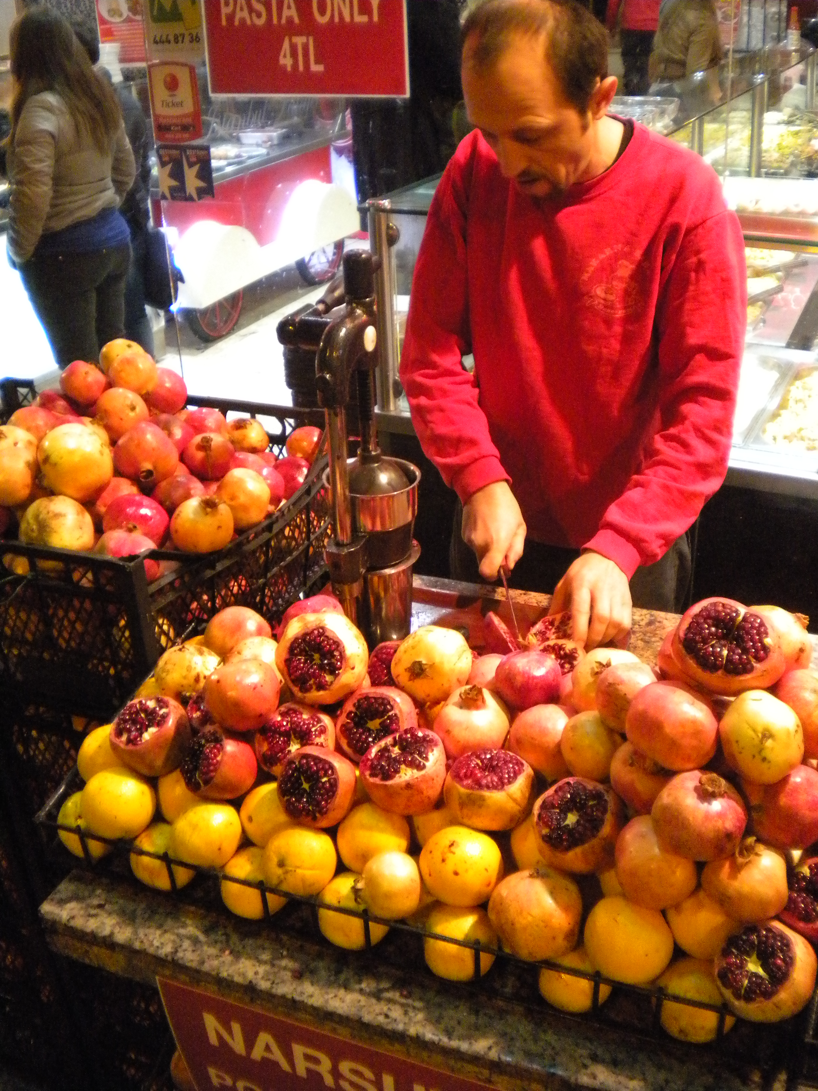 Whereas Pomegrantes are highly seasonal and can be quite expensive in the United States, they seem to be all-to-common in Eastern Europe and into the Middle East. And as such, there were vendors fresh-squeezing generous glasses for passing pedestrians for about $1 a pop (which utilized the juice of 3-4 whole pomegrantes). So, much like my daily ritual become drinking Orange Juice from the vendors in Morroco, I pretty much drank my weight in Pomegrante Juice while in Turkey