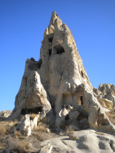 The peak of Mount Erciyes, a previously active volcano, is visible on the horizon from virtually any perspective in the Cappadocia region: a solemn reminder of how the distinctive features of the region were originally formed.  As the volcano erupted various times throughout its millenia of existence, striated layers of soft rock were formed — one on top of the next — and then subsequently eroded away over the course of hundreds of thousands of years by wind and water.  The result is the remaining caverns, valleys, cliffs, and rock formations that give this region its peculiar vistas.  The most notable features on the landscape are tall ant-hill-shaped columns in which previous occupants have carved out the interiors and created living spaces to shelter themselves from the hot summers and harsh winters outside.  So if you were were a traveler happening upon the area many years ago, you’d likely be a bit taken aback by these structures — some stretching over a hundred feet tall — but each with a trail of smoke being emitted from the peak (from the cooking fires inside).  Picturing this sight and the confusion as to how these structures came into existence, it isn’t hard to ascertain where the name “fairy chimney” originated.  I chose the small town of Goreme as my jumping-off point for exploring the area, but finding a tour or guide in any of the surrounding towns is quite easy.