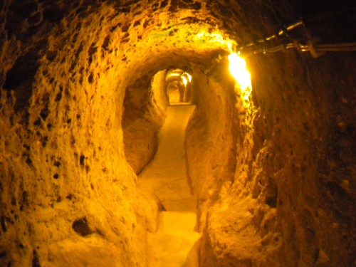 Another one of the most popular attractions in the region is the network of underground tunnels that, much like the layout of an ant farm, form entire cities below ground (though these are made to house humans, not ants, of course).  The sophistication of the caves, which date back to 7th and 8th century B.C., was absolutely astounding, as included among the amentities were grain storage rooms, wineries, kitchens, ventilations shafts, chapels, and even stables for horses.  I visited the Derinkuyu Underground city, which reaches depths of 85 meters, consists of at least 11 floors (which have been excavated so far), and could supposedly house a staggering 35,000-50,000 people for months at a time without venturing back to the outside world above — though admittedly, it probably never achieved those lofty population goals.  Given the difficult lighting conditions below ground, however, most of my pictures didn’t turn out too well, so I’ve only got two to show you.  But rest assured, it is quite and experience to crawl through these tunnels and chambers (though anyone even remotely clausterphobic should avoid this site like the plague):
