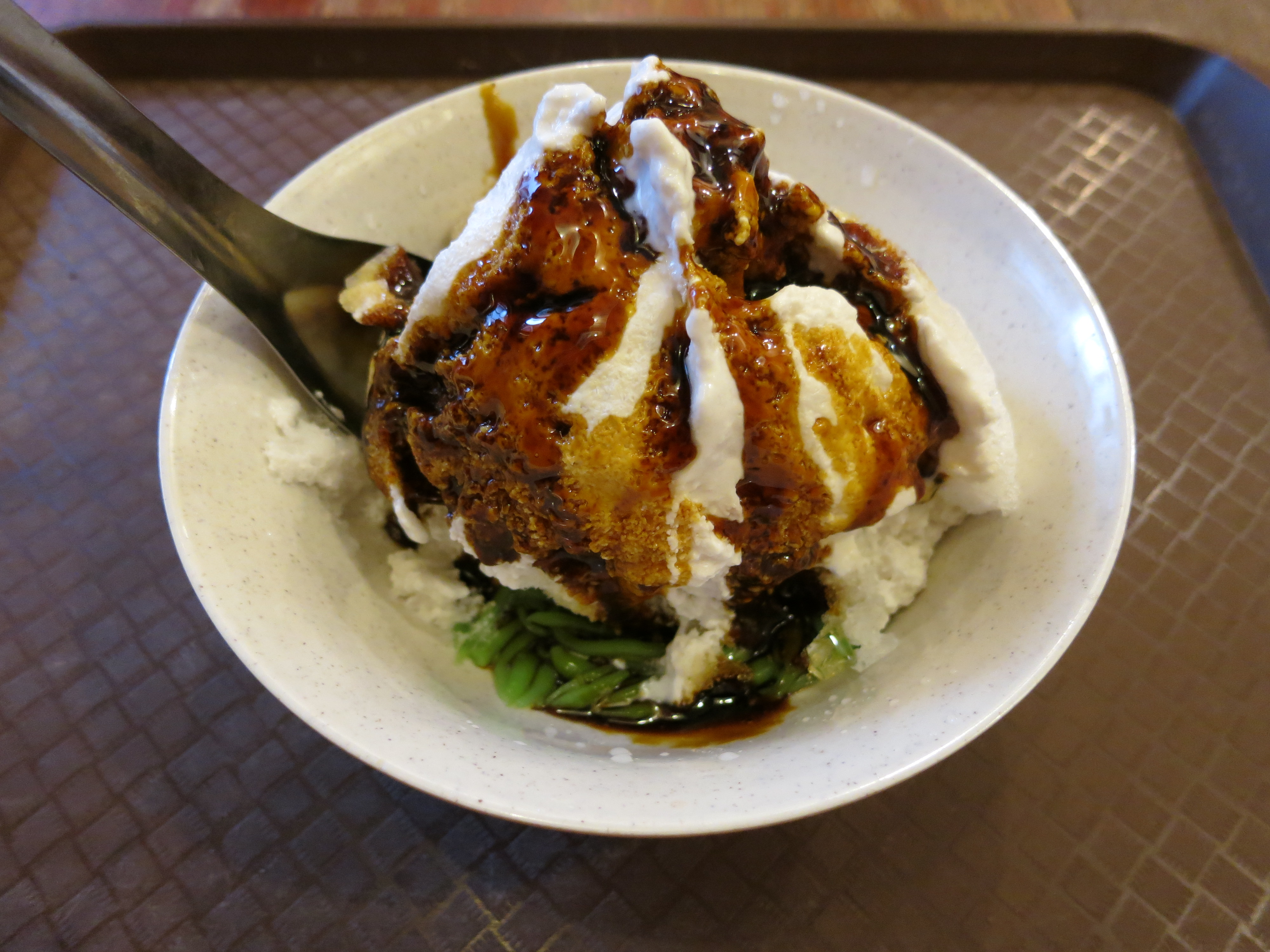Cendol for dessert: a mix of coconut milk, palm sugar, red beans, and a whole host of grasses and jellies, all served over a bowl of shaved ice