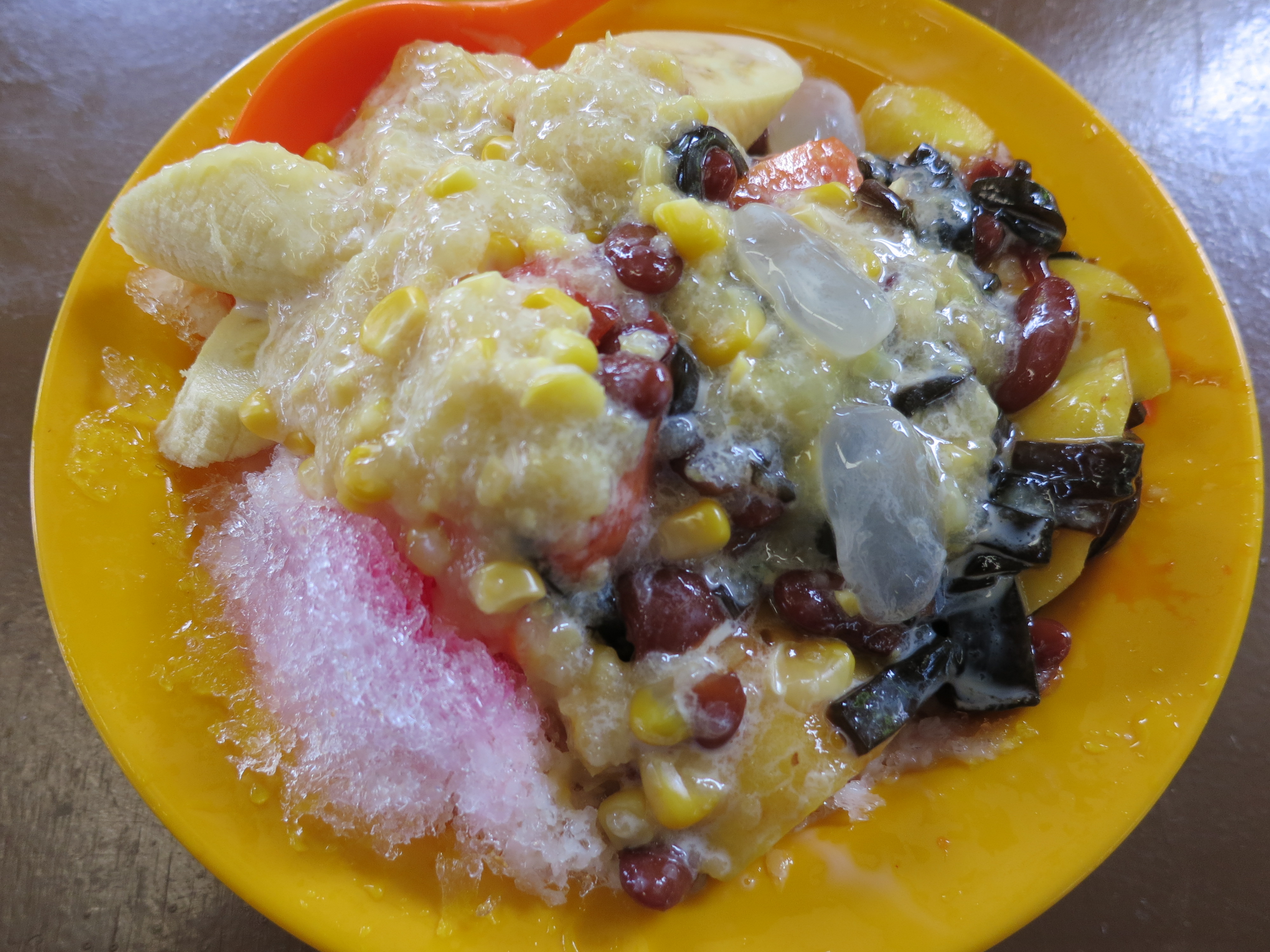 Kachang (similar to Chendol) is a mish-mash of grasses, sugars, syrups, beans, and fruit, all tossed over a bed of shaved ice