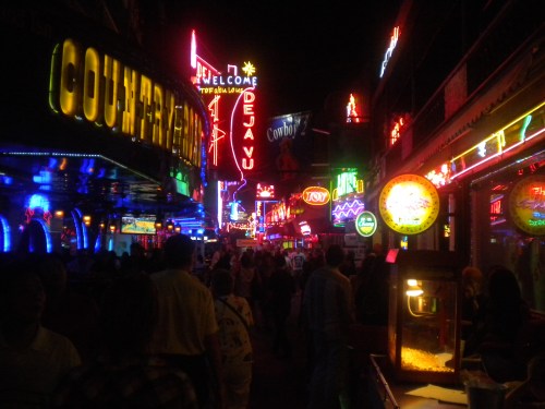 The neon glare of Soi Cowboy, the area where those looking to satisfy their deviant desires venture, as opposed to the more famous (and surprisingly touristy) Patpong Alley