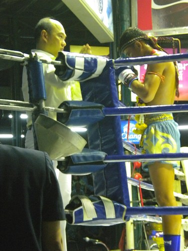 Being that my stay in Bangkok overlapped with that most ignominious holiday of Valentine’s Day, I was faced with the decision of how to celebrate.  Being that I’m just a solo traveler, I wasn’t up for enduring the embarrassment of being labeled “that guy” out at the bars and restaurants eating by myself, and venturing over towards Soi Cowboy or Patpong Alley isn’t really my cup of tea.  So after much deliberation, I decided the best way I could celebrate this romantic holiday was to watch a bunch of Thai boxers beat the tar out of each other instead.  The style of Thai Boxing is known as Muay Thai, and it involves using any of the eight points of contact (punches, kicks, elbow strikes, or knees strikes) to inflict damage upon one’s opponent — as opposed to traditional boxing in which one can only use the hands.