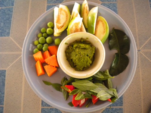 The ingredients for the curry ready for the wok. And notice that fine-looking curry paste in the middle that only could have been made the old fashioned way, with a mortar and pestal – though just thinking about it makes my elbow hurt again.