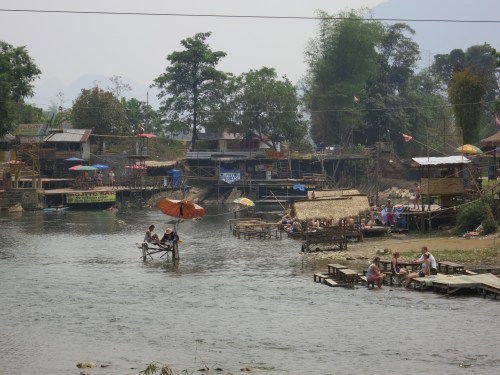 The bamboo pole-supported bars overhanging the Nam Song River