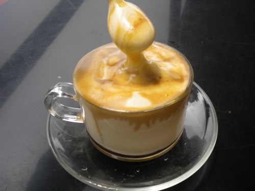 And then there is my new favorite caffinated beverage on the planet: Ca Phe Trung (also known as “Egg Coffee”). The recipe is quick and easy to master: simply take a cup of Vietnamese coffee, drop in a cracked egg, and whisk it up until it is a delicious, sludgy mess of goop