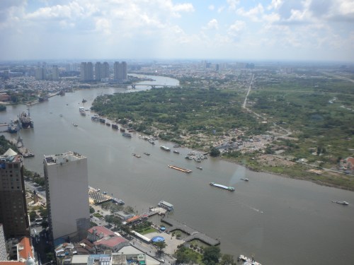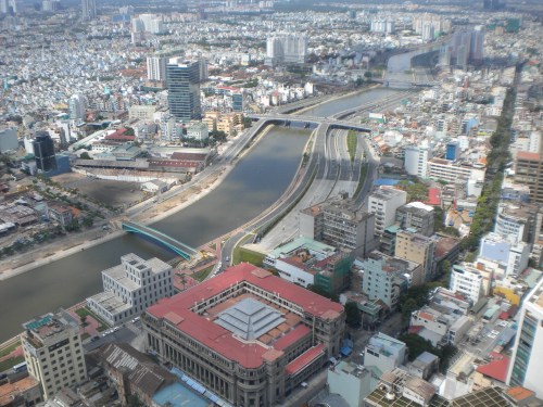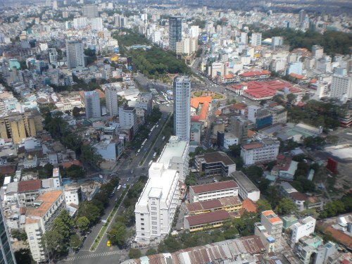 If you’ve been following my adventure for a while, I’m sure you’re well aware of my penchant to hike, climb, scale, or otherwise ascend to the highest point within eye-shot in an attempt to gain a better view of the surrounding lands. Unfortunately, Saigon is almost entirely devoid of pleasant hillsides or scenic mountains, but fortunately, they do have one gigantic tower that stands out against the skyline . The Bitexco Financial Tower allows visitors to gain a bird’s-eye view of the city from the observation deck 50-some stories up, all for about a $10 admission charge. Behold, the city of Saigon as seen from above: