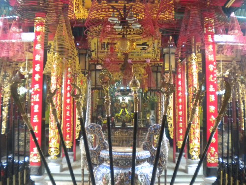 Once you’ve strolled down the former Rue Catinat, wandered the backpacker hangouts, shopped to your heart’s content (or your’s wallet’s dismay) around the Lam Son Park, and viewed the city from above, another great option to explore the culture of Saigon is to grab a cab (preferably a motorbike taxi) and head for the neighborhood of Cholon, the Chinatown area of Ho Chi Minh City. All the charms of a normal Chinatown are present — a bustling market filled with vegetables and animal parts you previously didn’t know existed, cramped alleyways snaking to who knows where, dozens of restaurants serving up mouth-watering dishes, and more dialects being spoken than you can count — but the highlight is a trio of Chinese-style temples that all lie within a block of each other: