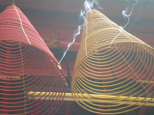 The haze and aroma from incense spirals hung along the ceiling help to create a mystical atmosphere inside the temples