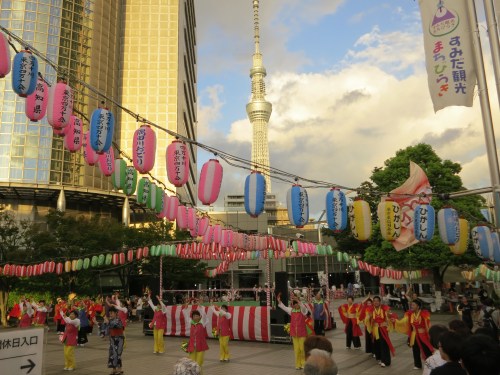 A festival in progress outside of the Asahi Building, with the Tokyo Sky Tree standing tall in the background (more on that later)