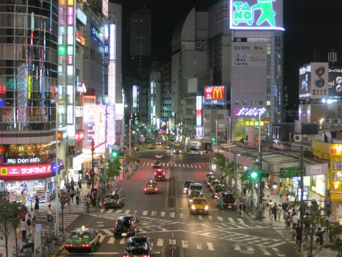 The brightly-lit streets as seen from above