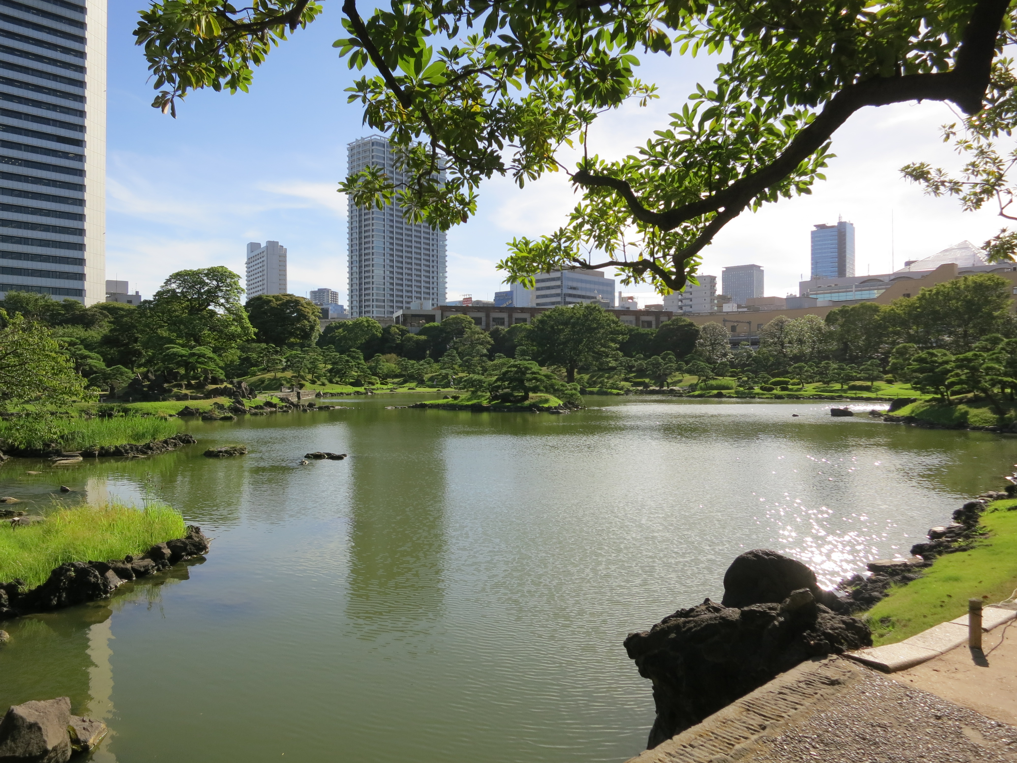 Reflections of the city in the Kyu-shiba-rikyu gardens