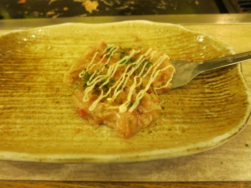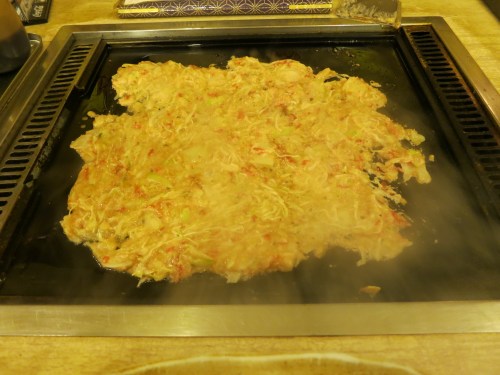 Monjayaki is another of the meal-come-entertainment options. This Tokyo-specific riff on Okonomiyaki is essentially a liquid batter with a variety of veggies and ingredients mixed in, then spread out flat on a griddle in the middle of the table and allowed to cook until crispy