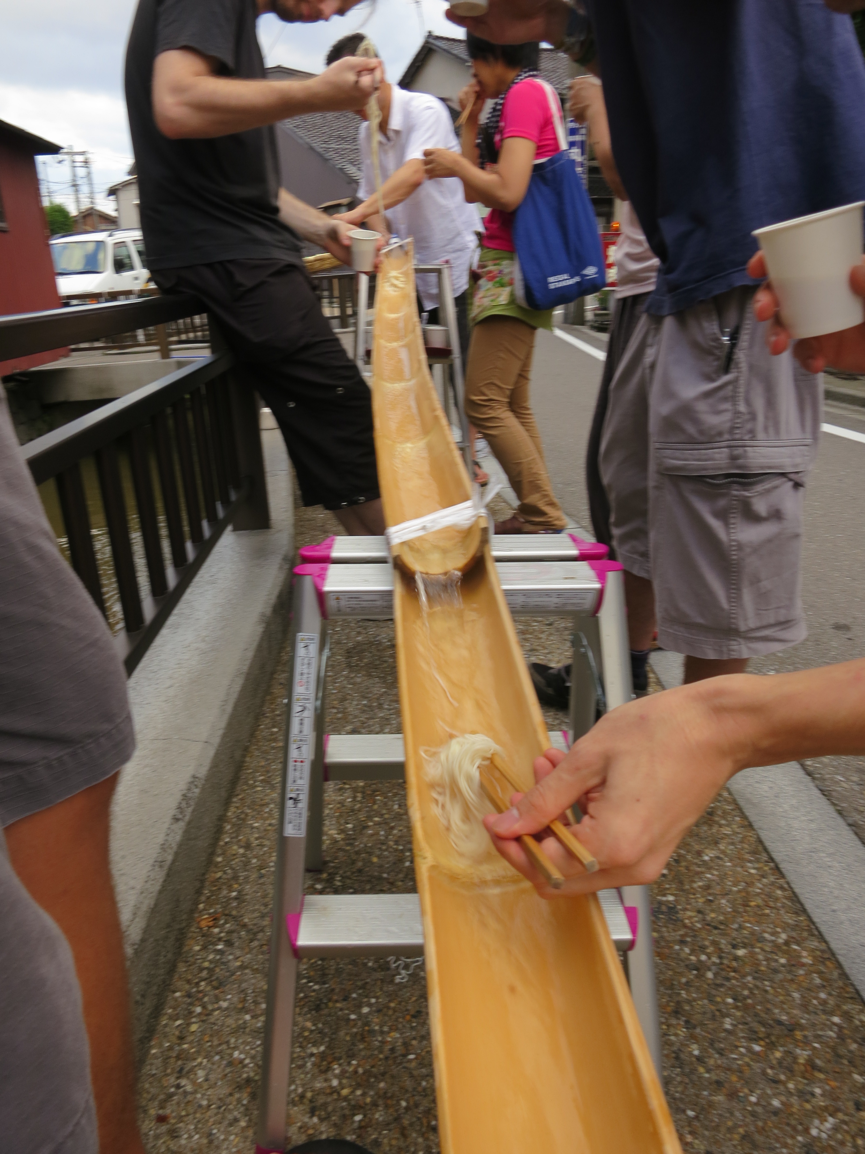 You then surround the bamboo slide, turn on the hose, and enjoy trying to catch the bunches of somen noodles as you chute down the slide