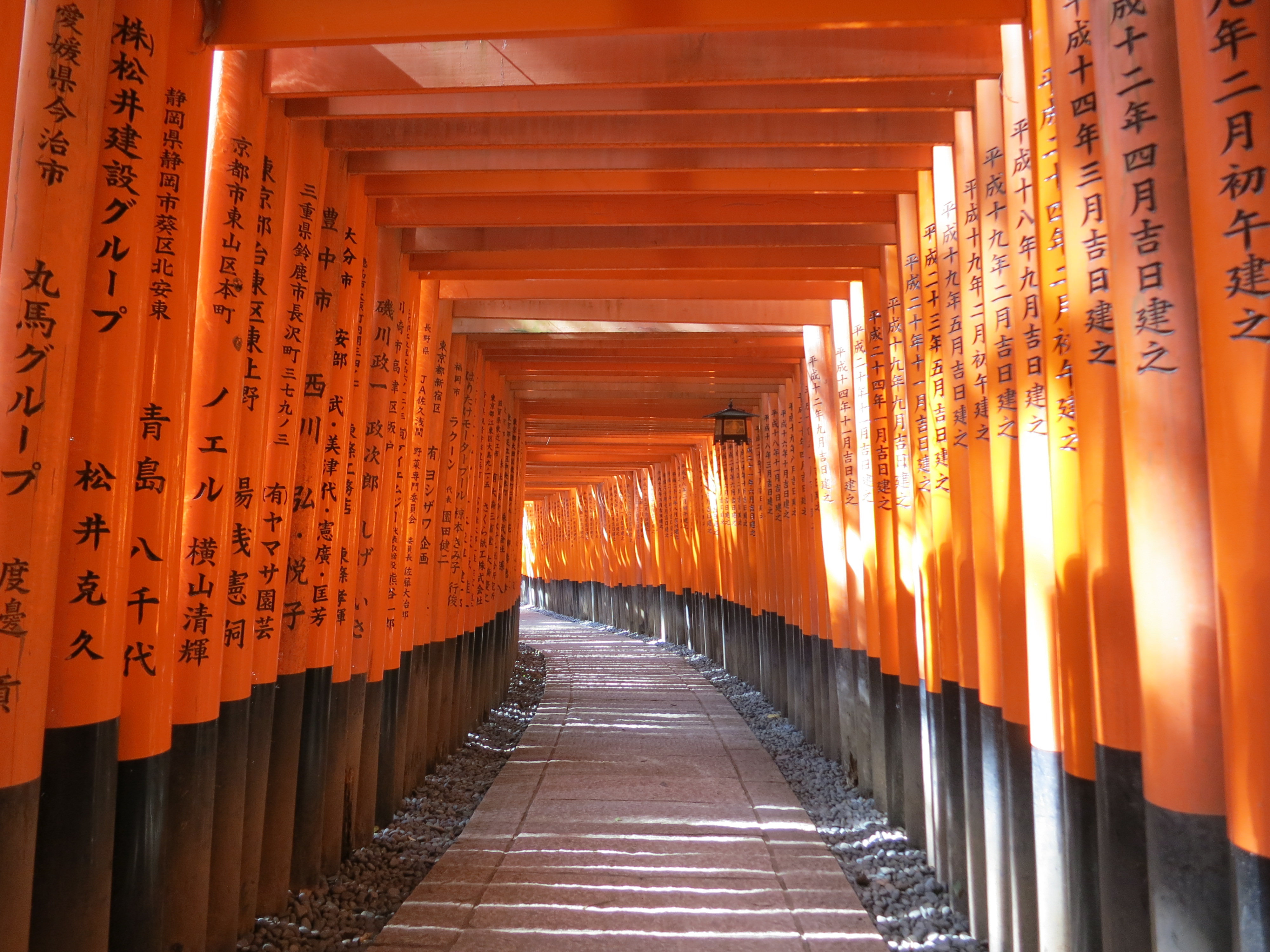 The many Torii gates form a colorful tunnel around the walking path the entire way up the mountain