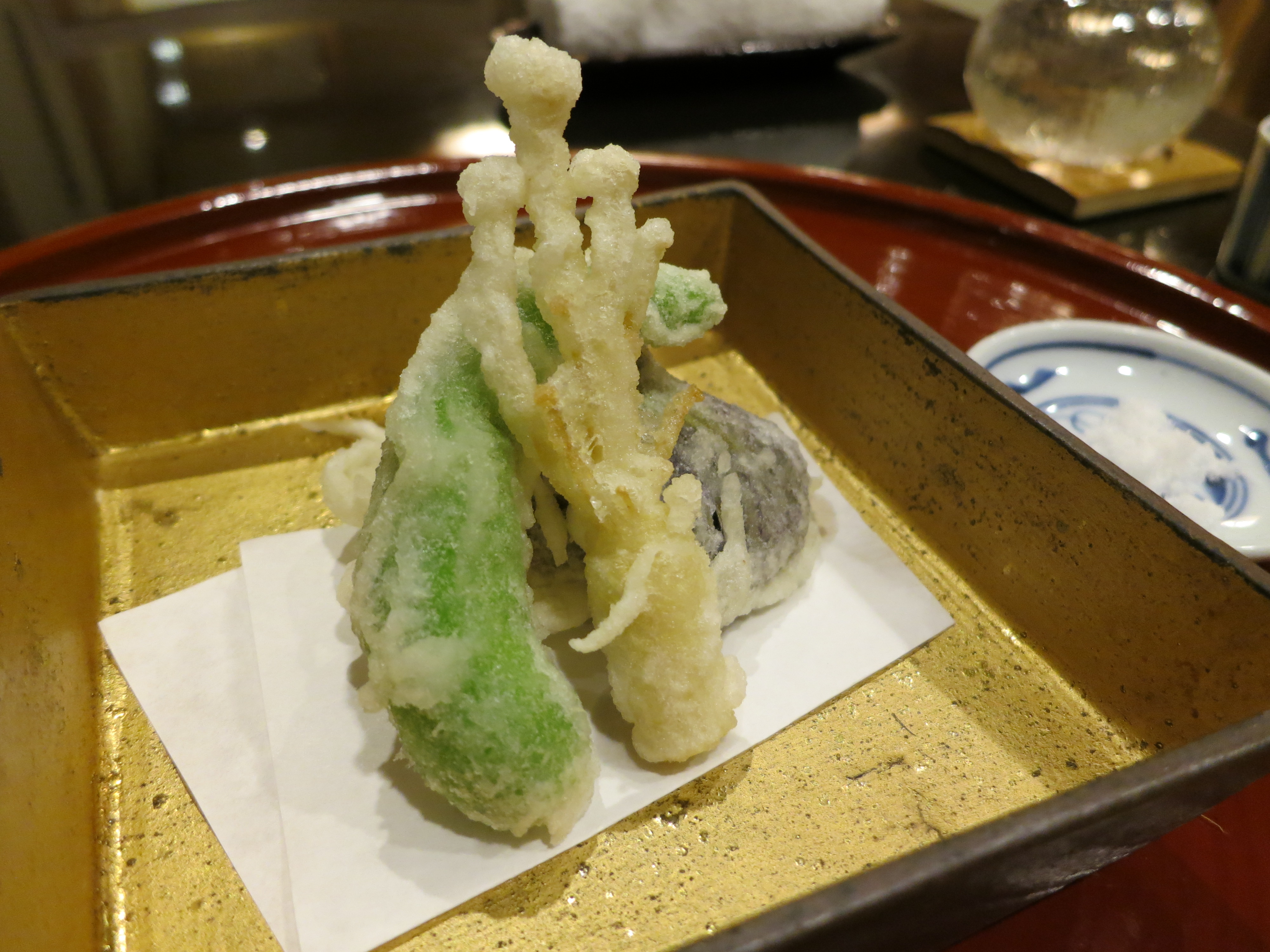 Throughout a Kaiseki meal, the diner will usually be served dishes using a variety of cooking methods (i.e. – one raw, one grilled, one steamed, etc.). This luckily also includes a fried dish — in this case, tempura enoki mushrooms and hot peppers
