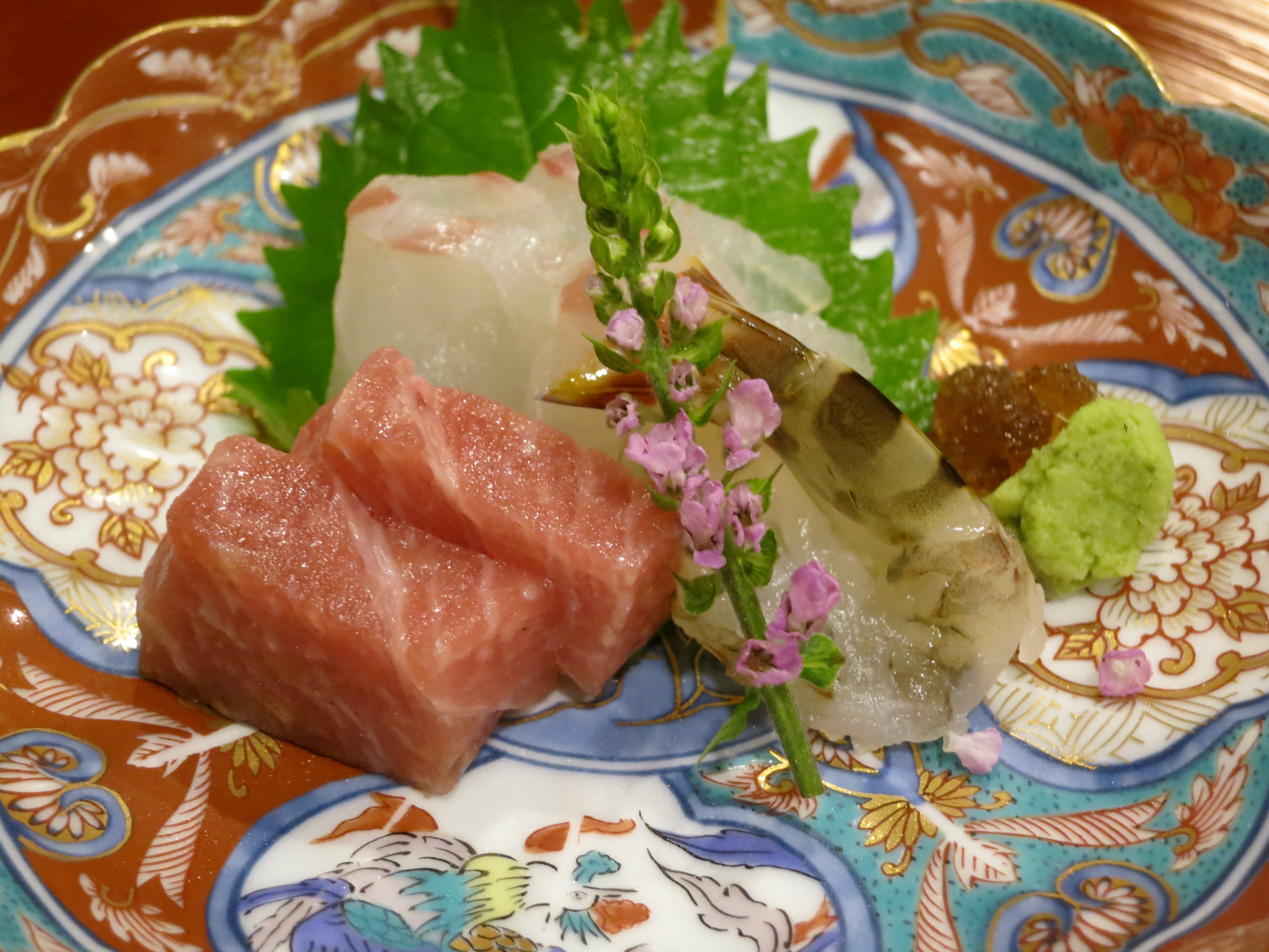 Red Snapper, Toro (Fatty Tune) and Prawn Sashimi