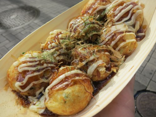 Getting to the heart of the matter (the food) and in keeping with the tradition that each town and region in Japan boasts its own specific dishes native to that specific area, Osaka is famous for two creative and unique dishes: Okonomiyaki and Takoyaki, the former being a grilled, savory pancake-like creation and the latter being octopus dumplings.