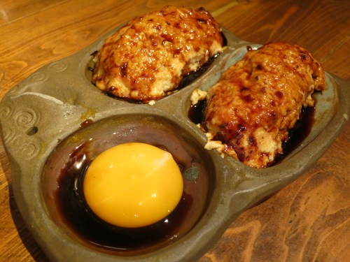 This was the result of walking into an Izakaya, not being able to read the Japanese menu, and taking a random guess. It was two ground chicken patties soaked in soy sauce, then (lightly) baked and served with a raw egg as a dipping sauce