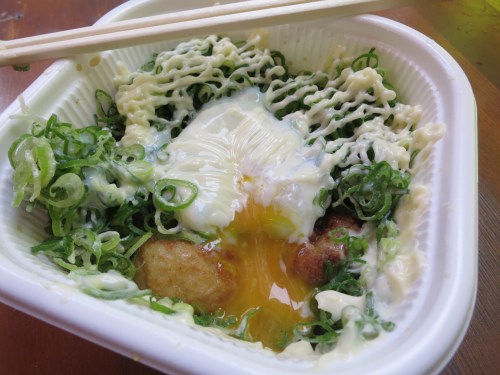 Another variation is known as Akashiyaki (from the city of Akashi), in which the chunks of octopus are coated in an egg batter as opposed to the more traditional tempura-like batter, and then are to be dipped in dashi (a seaweed and fish broth) on their way up to your mouth