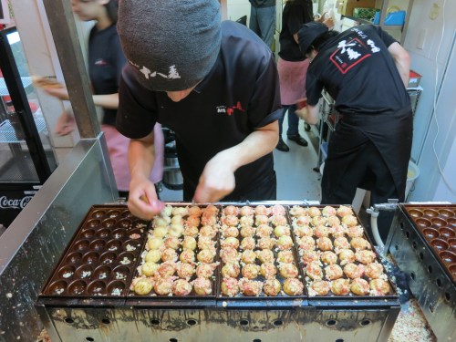 A Takoyaki vendor taking special care to tend his tasty treats with a pair of chopsticks (and trust me, these guys are fast)