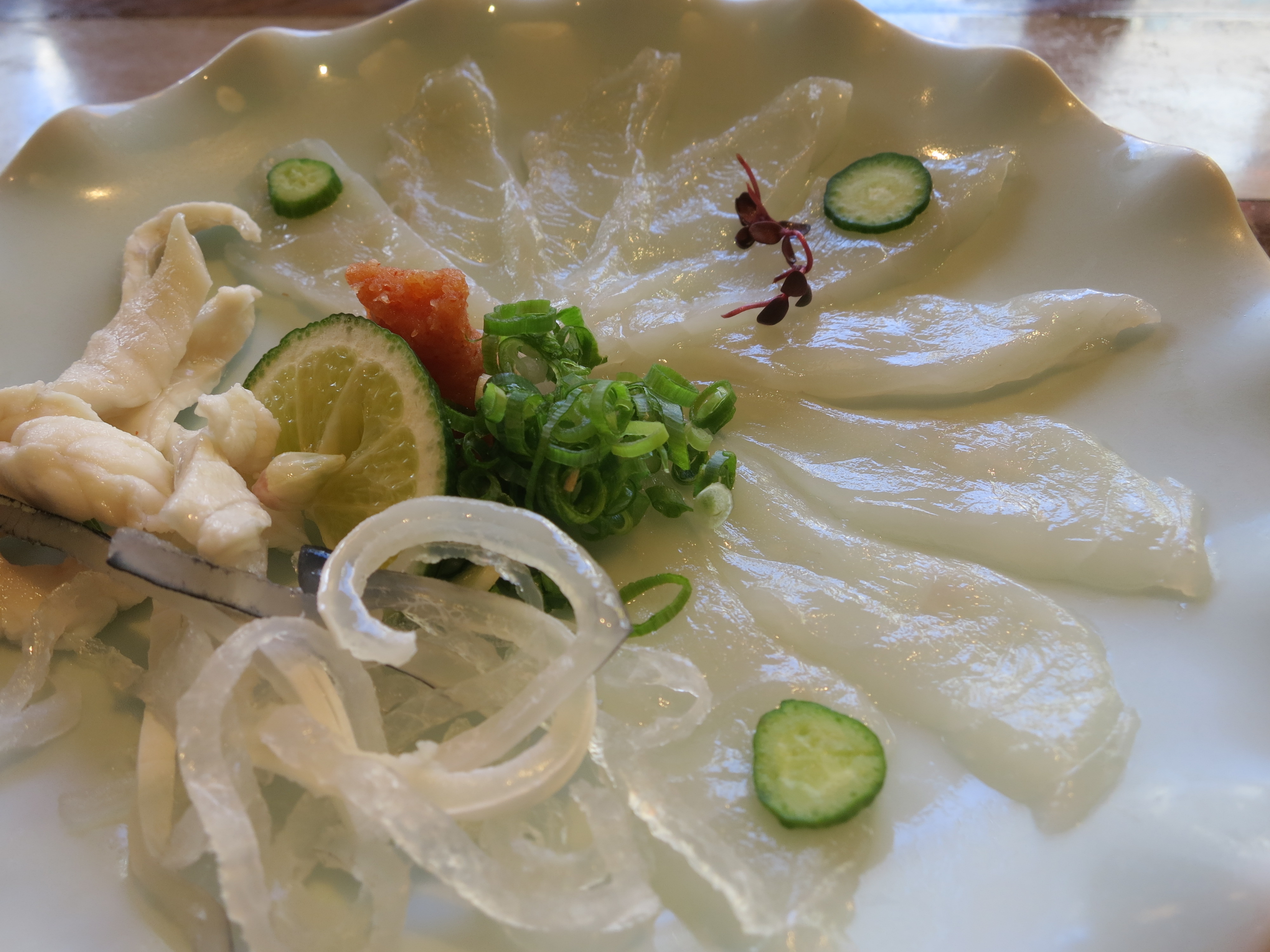 Sashimi of Fugu – the infamous poisonous blowfish. The chefs are specially trained to cut away most of the poisonous bits of the fish, but to leave just enough that it gives your tongue a subtle, tingling sensation