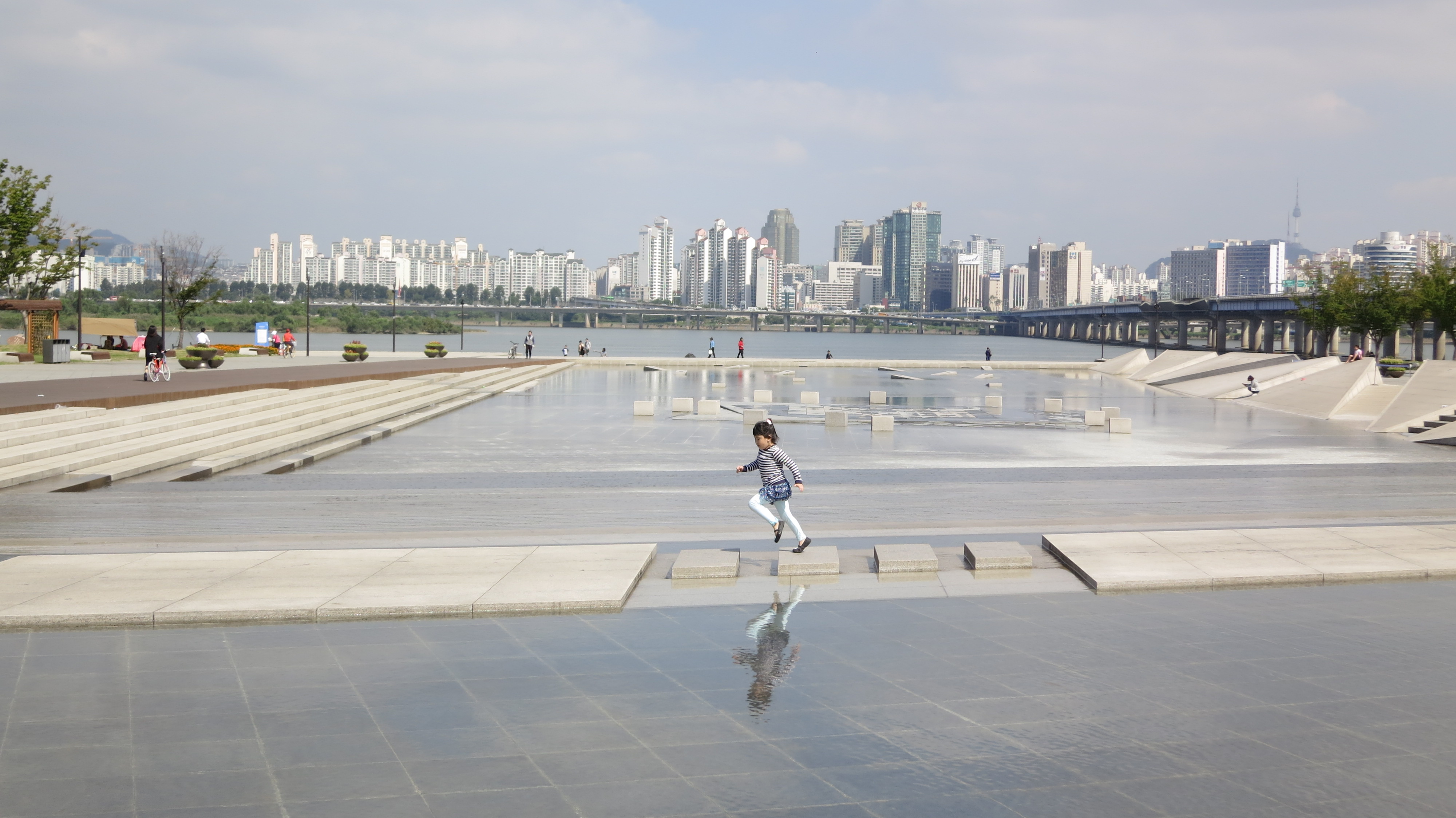 A child playing in the fountains in the Yeouido Hangang Park