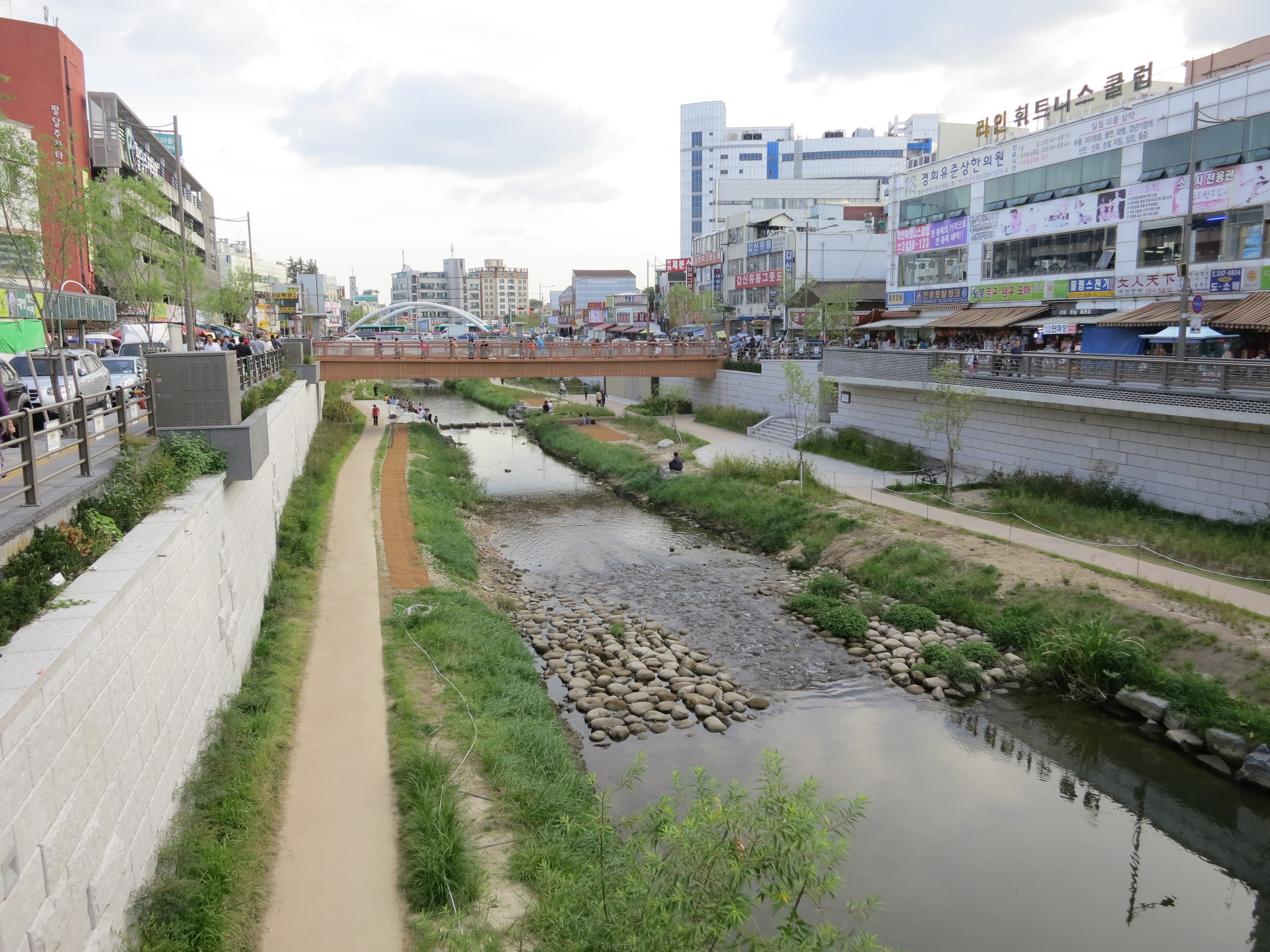 Overlooking the Suwoncheon, with open-air markets located on either bank
