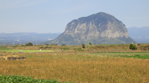 Farmers tending to the fields with Mt Sanbang rising in the distance