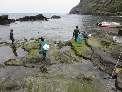 A group of haenyeo, clad in wetsuits and with nets in hand, heading out for another round of diving