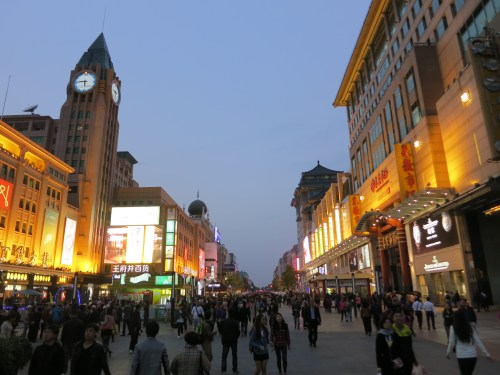 Wangfujing Dajie at sunset, a posh shopping street that houses many of the high-end designer boutiques and Western hotel chains