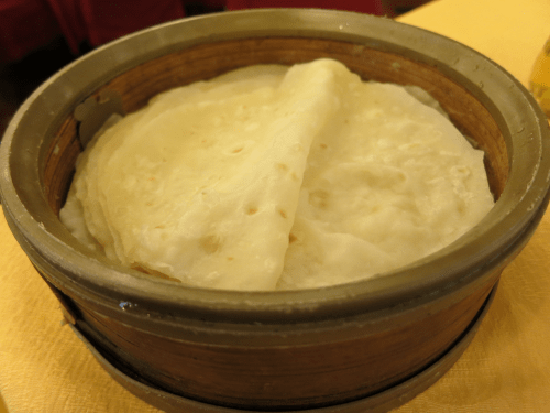 As you’ll notice, you’ll also be served a basket of thin, steamed pancakes in addition to a dish of julienned scallions and a soy bean-based sauce