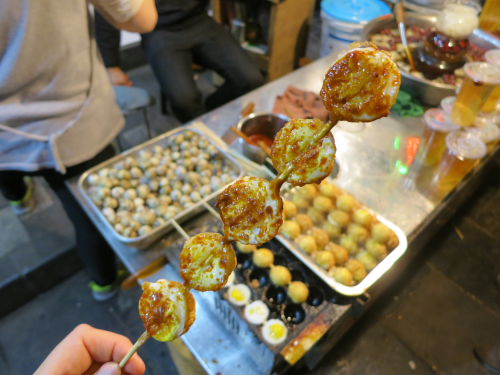 Kao Anchun Dan – A skewer of 5 tiny quail eggs cooked in a special griddle and splashed with chili oil (of course)