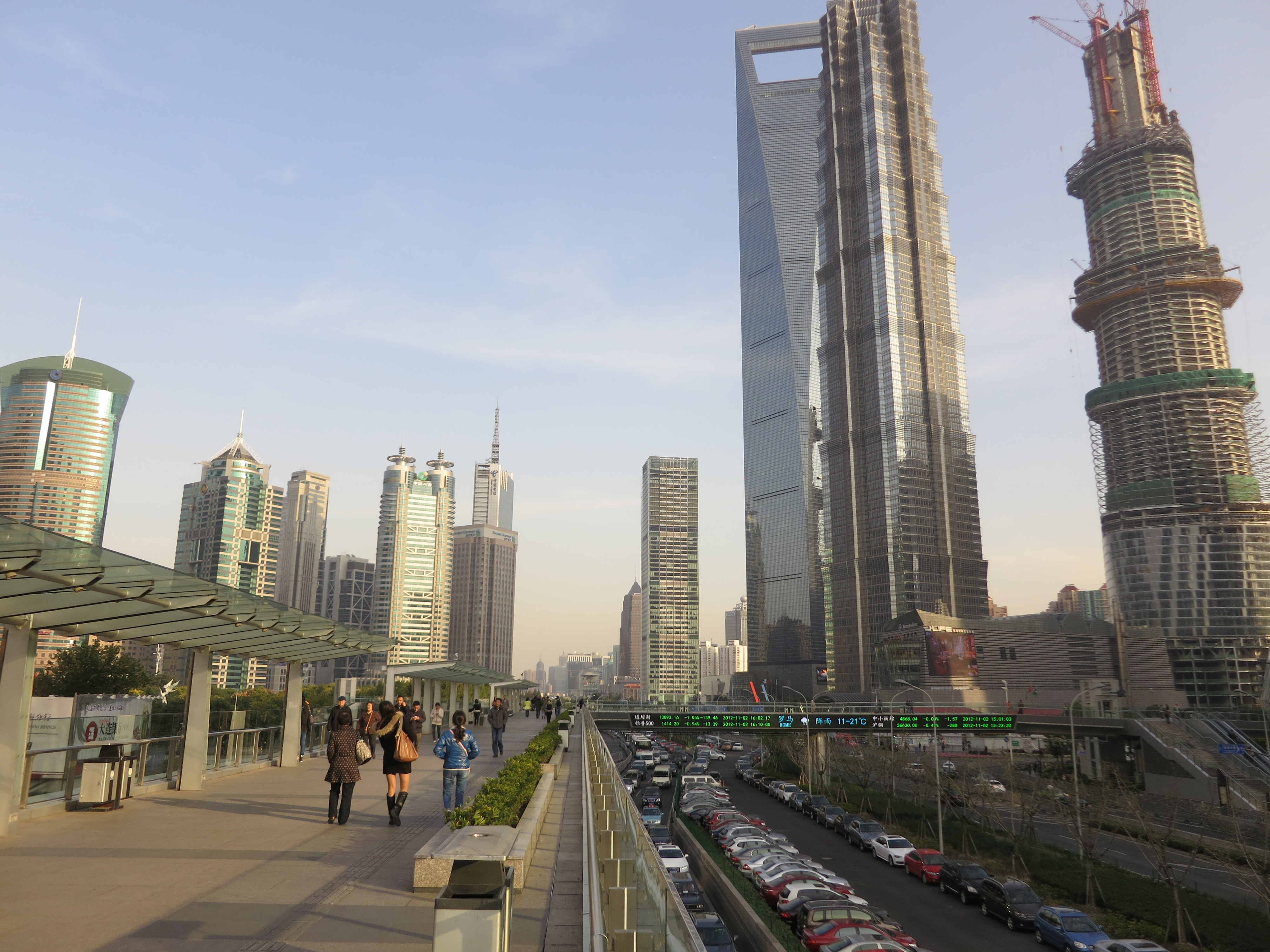 The Pudong section of town, across the harbor to the East of the heart of Shanghai, is the skyscraper epicenter of the ctiy. In this photo, you can see the World Financial Tower (that looks like a bottle opener), the Jinmao Tower (just to the right), and the as yet unfinished Shanghai Tower (at the right edge), which will be the tallest buidling in China